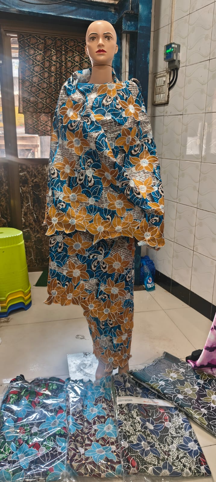 Cotton embroidery lace is a soft, breathable fabric made from natural cotton, featuring delicate embroidered patterns in a lace style. It combines comfort with elegance, making it ideal for adding decorative borders or panels to garments like abayas, kaftans, dresses and kurtis. It gives a light, feminine and refined finish to any outfit.